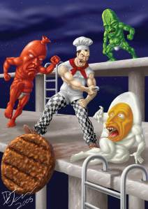 So I was just digging up images of Burgertime for an article I’m wrapping up, and I stumbled on this collection of game interpretations/parody art by one Handre De Jager. Obviously these are old, since I found a gamesetwatch post about them from January ’06. Still, dig ’em, I think they’re insane: