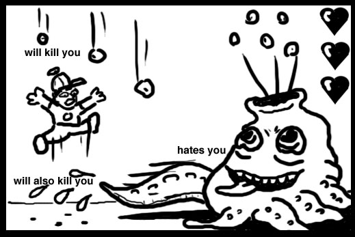 A little more complex is the Ultimate Attack Pattern where at certain invervals of a Boss’s life, they do a move that hurts you NO MATTER WHAT. Some examples would be Dragons breathing fire across the whole screen or a Dude shooting bullets in all directions.