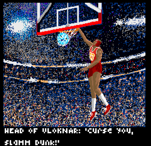 Here’s a screenshot from the rare gem Slamm Nation, a somewhat glitchy Slamm Dunk action game cassette released for the Nintendo Entertainment System in 1986. It was given a Nester Award for its “slammin’ graphics” (Nintendo Power, May/June ’97 pg. 47), but was also heavily criticized elsewhere for its somewhat dubious boss battles and confusing level design.