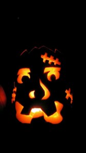 As we both carved at a feverish pace, it became apparent who the victor would be. As my Dr. Frankenstein’s Monster came to reveal itself, Nugget was busy bringing to life the visage of what appeared to be a baby with down’s syndrome that in turn looked like it had been possibly carved by a baby with down’s syndrome. Whining screams of “This is hard!” and “”I haven’t done this in so long!” were heard from my competition, and inspired me to carry on.
