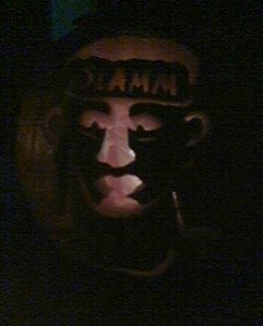 It’s tough to contain the mighty Slamm Dunk in a measly pumpkin, but I’ll be darned if I didn’t try. Sadly, the viewfinder on my camera is broken, so I couldn’t go to the menu and turn the flash off, hence the crappy cellphone pic of the candle-lit final product.