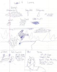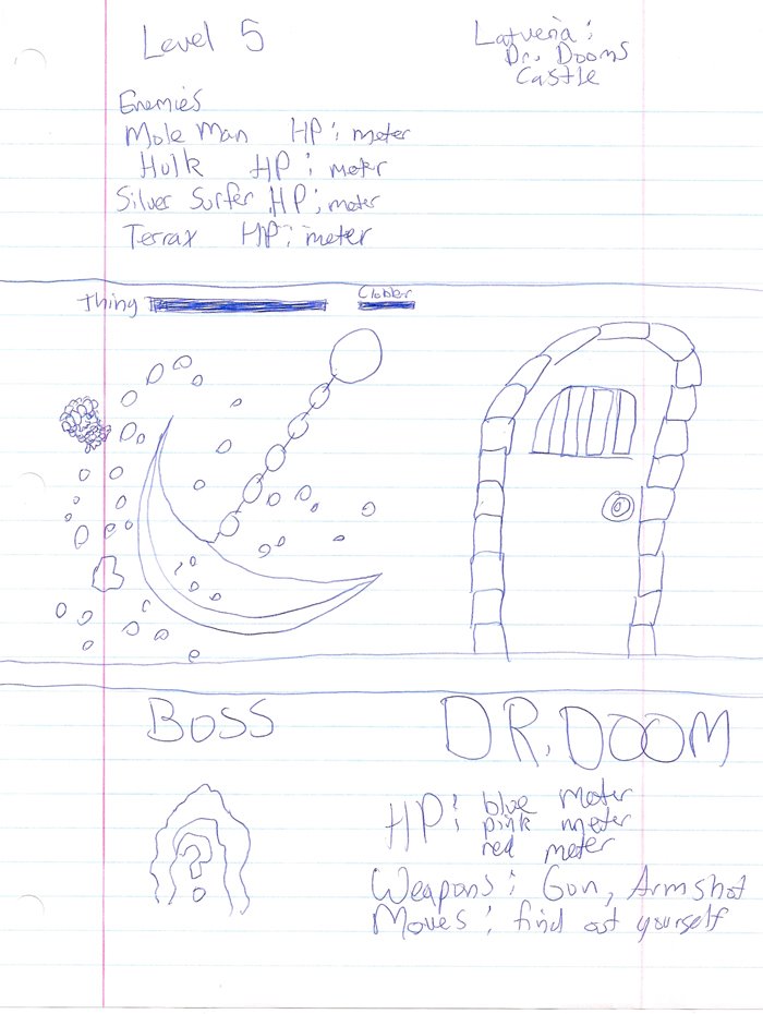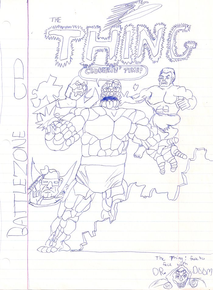 How appropriate that E3 is going on right now. While in Louisville, I unearthed these age old “design docs” for a beat ’em up called THE THING: CLOBBERIN’ TIME. Our research puts this somewhere around Earth Date 199X, when I was attending Middle School. Let’s have a closer look, okay? Please click each image to enlarge and study.