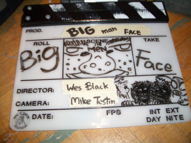 One of the handsome young men in our crew was quite taken by our hero’s universe, and would frequently doodle on the slate. I kind of fancy the name “Big Men Face”