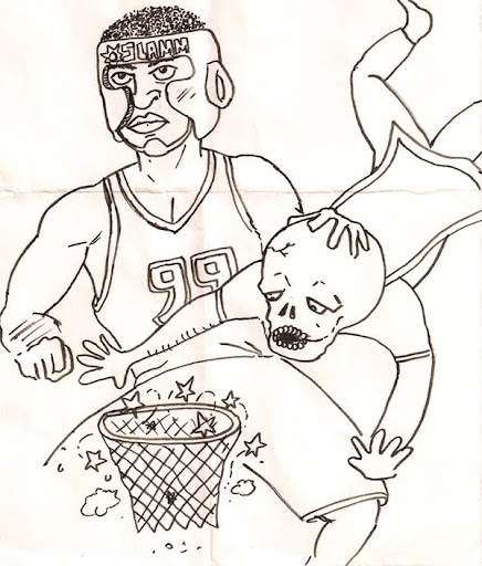 Here’s a treat I’ve been meaning to scan for ages. It’s the very first picture I ever drew of Slamm Dunk! This may be the only time he’s been depicted doing what he actually is supposed to do: dunking criminals into sub-space.