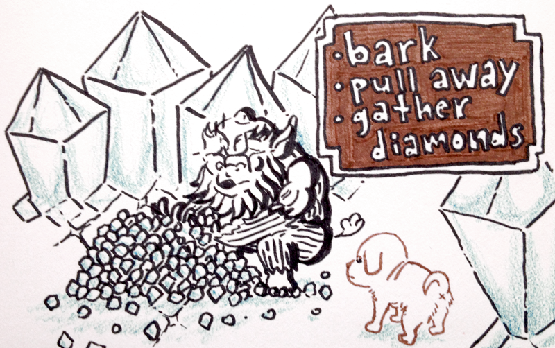 You start to move on, but [Throckmorton] is dazzled. He huddles over the pile of riches and marvels as they fall through his fingertips. He wants to take it all. Imagine the life we’ll live, the two of us as kings, he says as he starts to stuff diamonds in his fur.