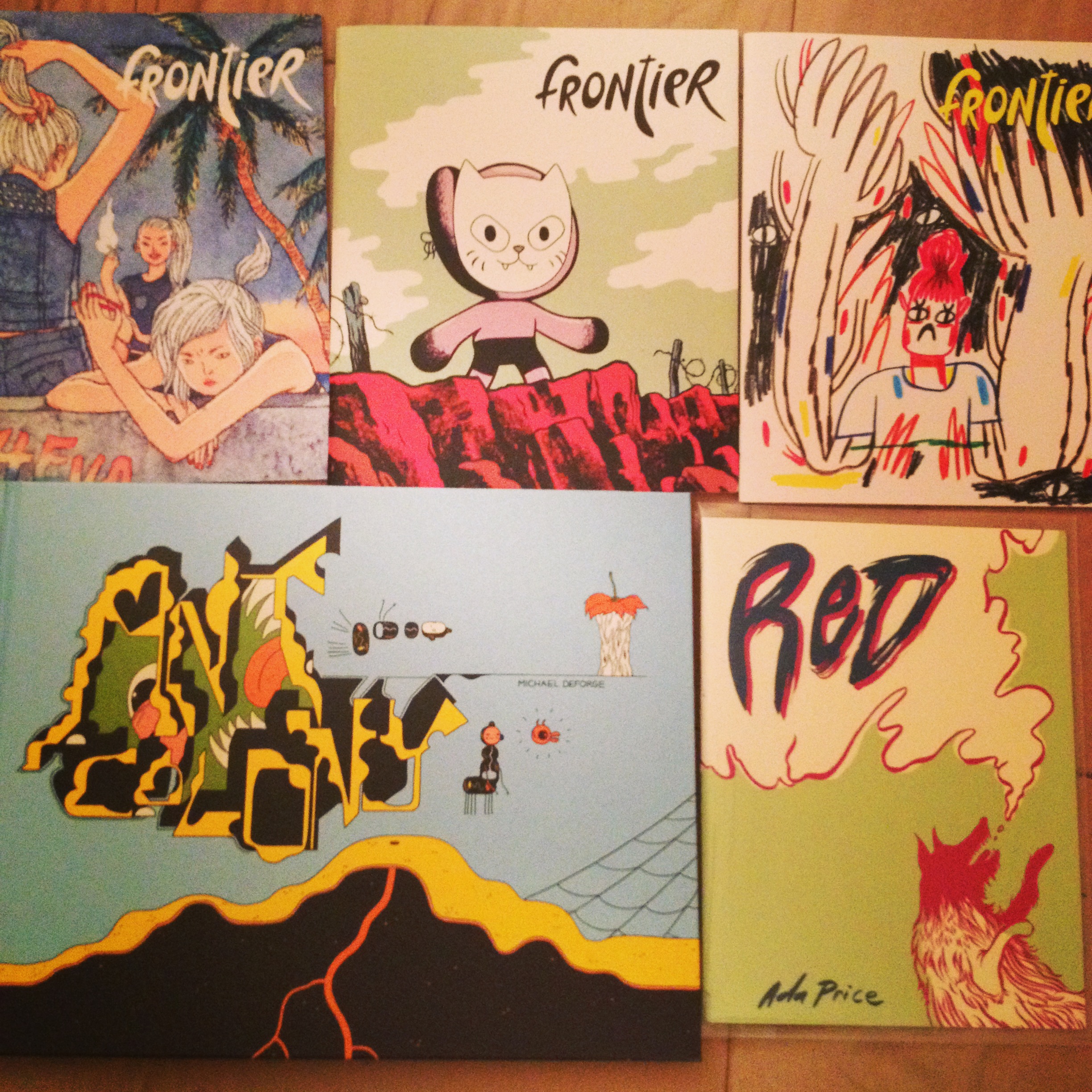 It was really tough not to spend approximately one thousand US dollars at the show, but I managed to be kind of reasonable. I picked up three issues of Frontier from Youth in Decline‘s booth, nabbed Ada Price‘s beautiful Red mini, and got a copy of Ant Colony, which I promptly handed to Michael DeForge so he could put a sketch and signature in it.