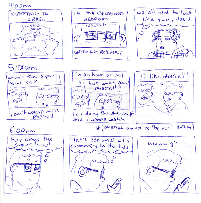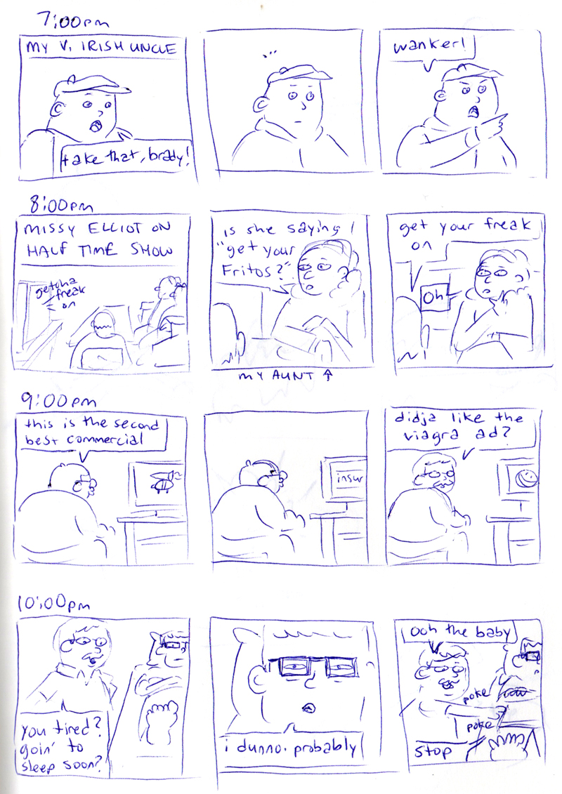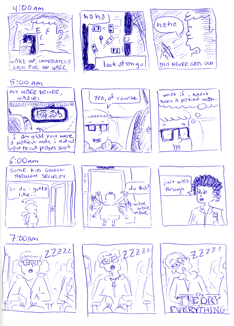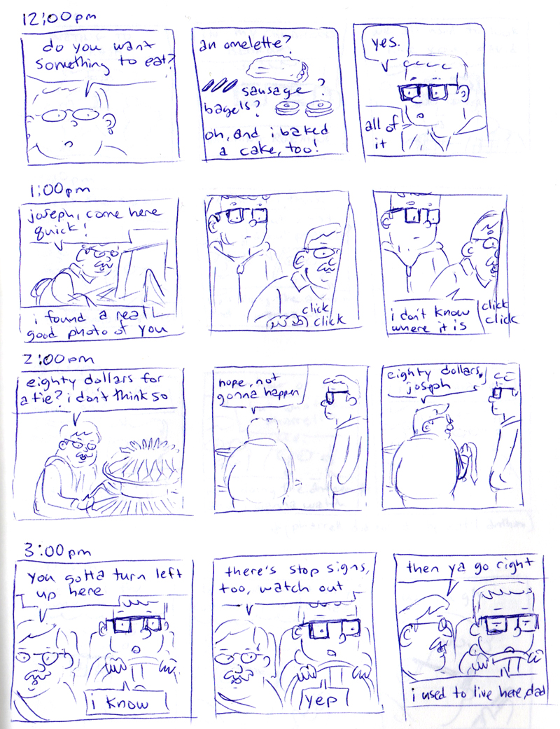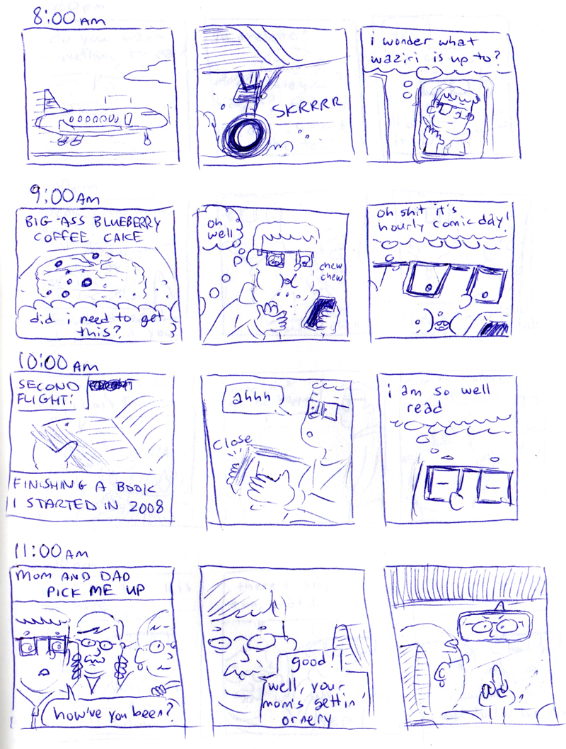 I always forget about it, but not this time! Hourly Comic Day takes place every year on Feb 1, and as you might have guessed, it involves drawing a comic for every hour you’re awake. This year I had the, uh, fortune of going home for a funeral, and Hourly Comic Day happened to fall on the day I was traveling and meeting up with my parents.