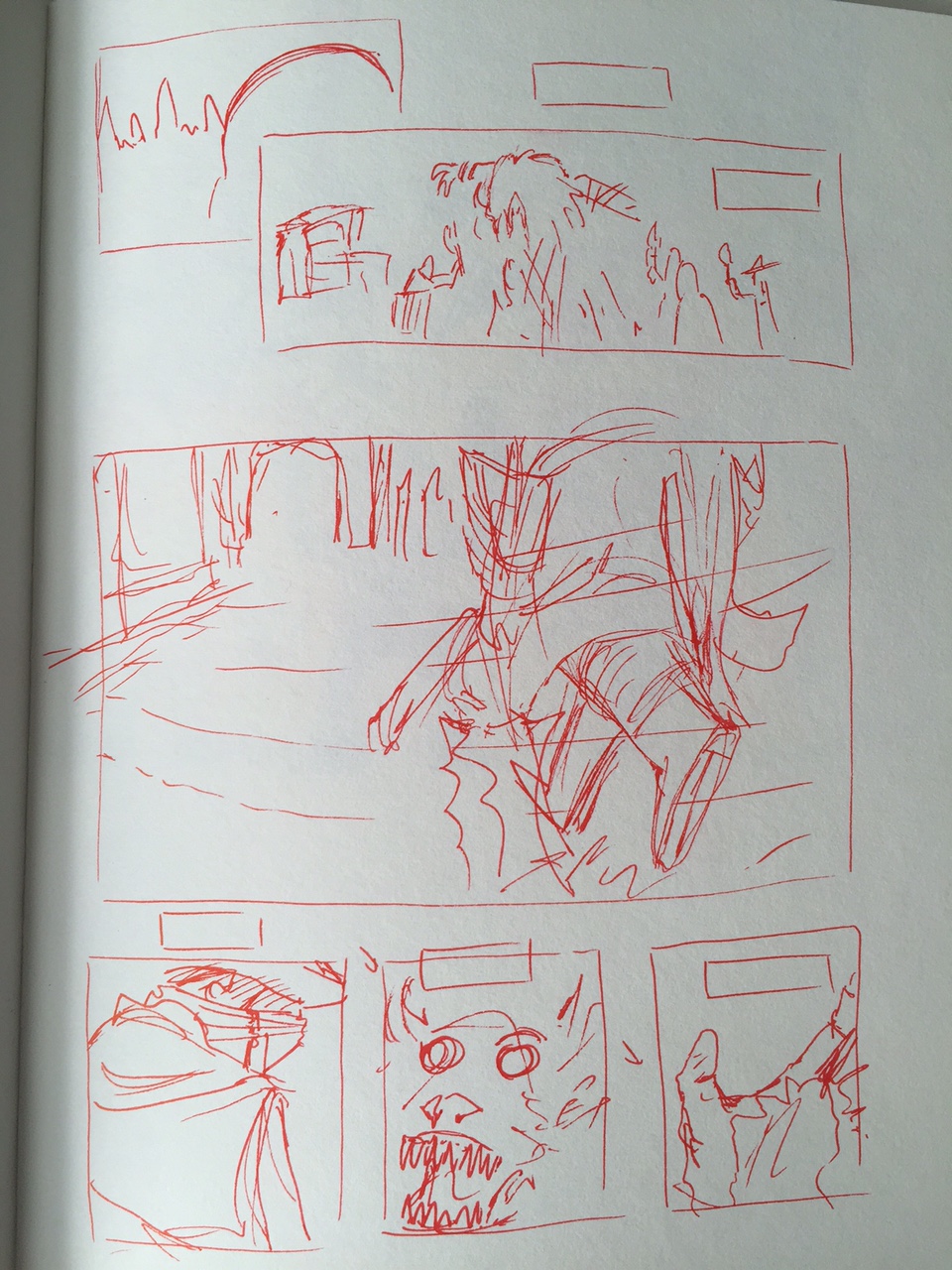 Here’s a quick self-indulgent post, which pretty much describes every post on a personal blog, I guess. Some of you may recall the Bloodborne comic I posted back in April. Well, I was just flipping through a sketchbook to get to a clean piece and I came across the original thumbnail for the first page of that one, so I thought I’d share it.