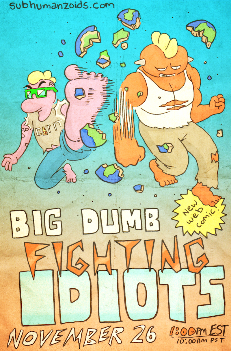 I think I mentioned it briefly before, but Big Dumb Fighting Idiots is going to be a webcomic, and the first installment launches on Thanksgiving! That’s just November 26 to everyone else, so mark your calendars no matter where you are!