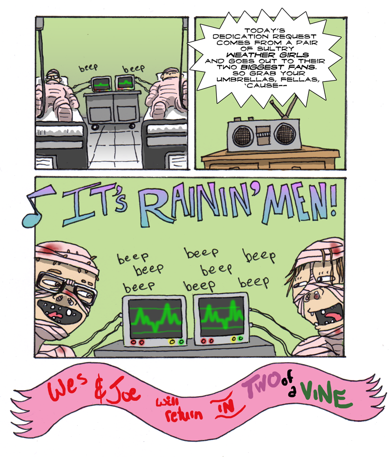 If you’re just joining us, the first issue of Two of a Vine saw our heroes, Wes and Joe, finding an unbelievably cheap apartment… with one catch: California Raisins only. Thankfully the Raisins don’t seem to notice Wes and Joe are just two guys in dumpy, gutter Raisin costumes, and so they live amongst them in the most bizarre of luxury.