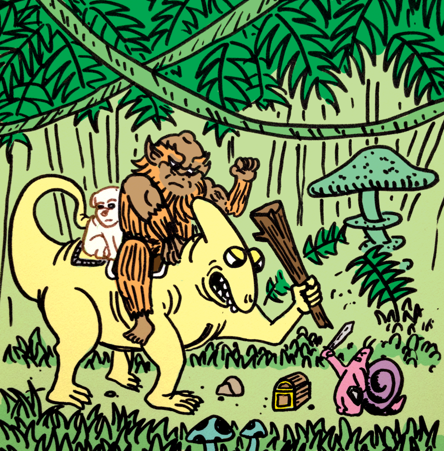 You brave the jungle with Throckmorton, boldly saddled atop your new friend Ramis. You hack away, deeper and deeper. You fight poisonous spider-shrooms. Swashbuckle snail soldiers like the little dude below.