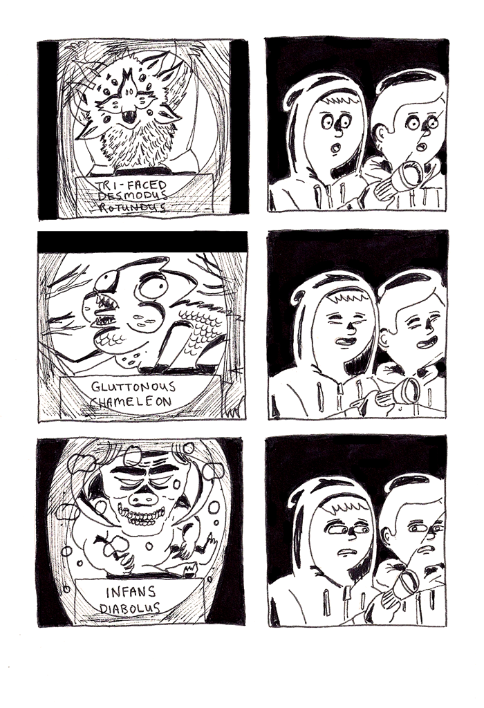 I also have a bonus treat for all the awesome people who drag their air-sacks here to read my blog on a regular basis. Below you’ll see a sample script page, in all its refined glory, for the first Buttmuscle story, followed by a gin-yoo-wine thumbnail page for my Halloween comic, Exhibit.